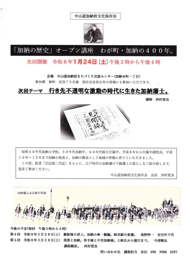 10月から始まった「加納の歴史オープン講座」も毎回好評で、次回のお知らせを致します。